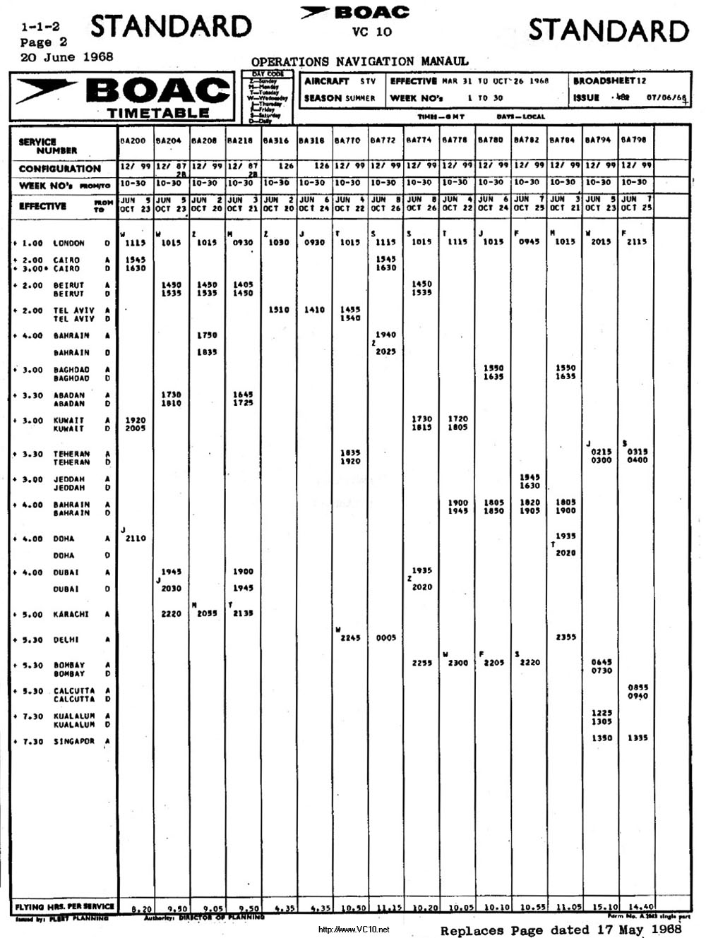 BOAC Standard VC10 1968 Summer Timetable