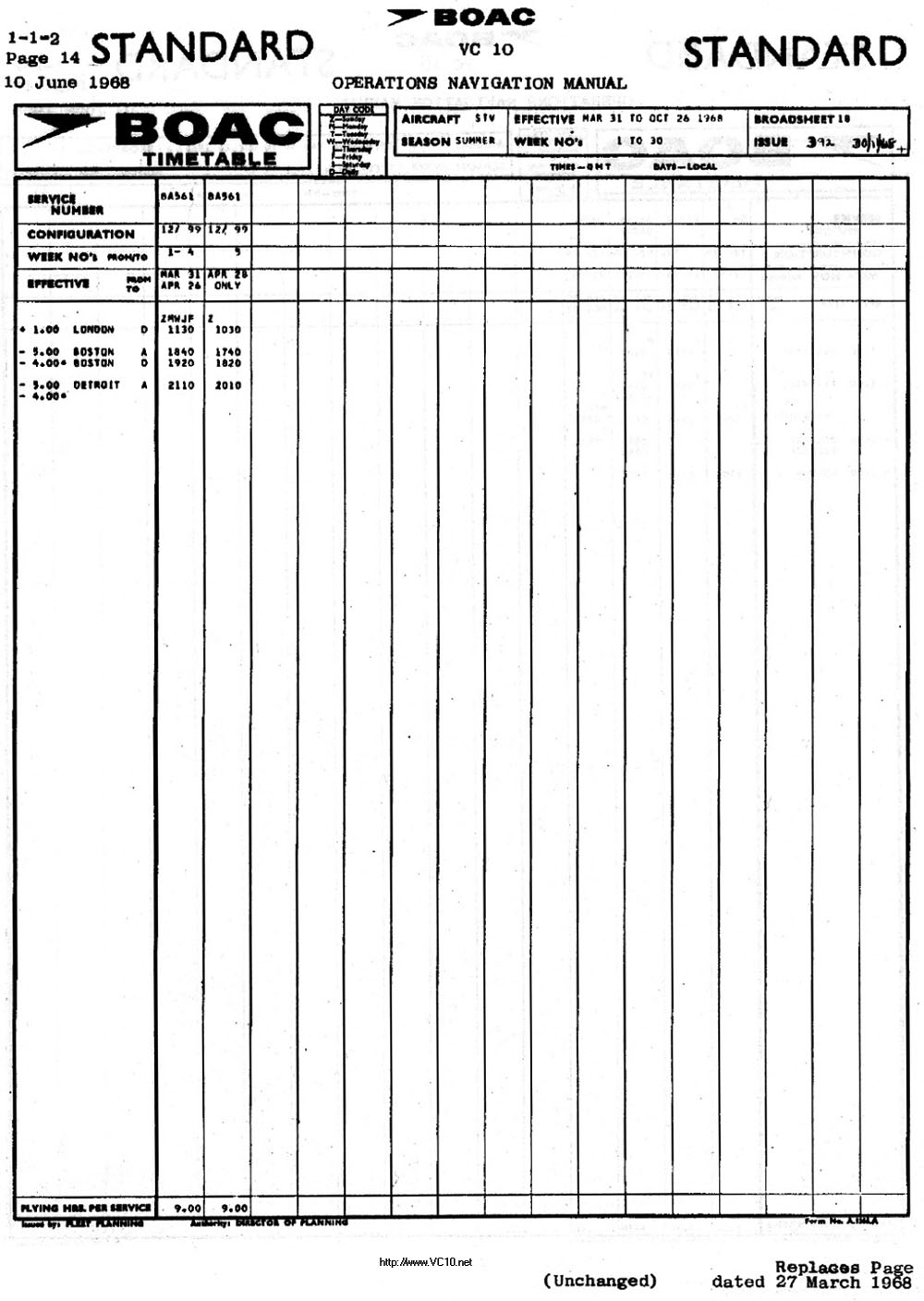 BOAC Standard VC10 1968 Summer Timetable