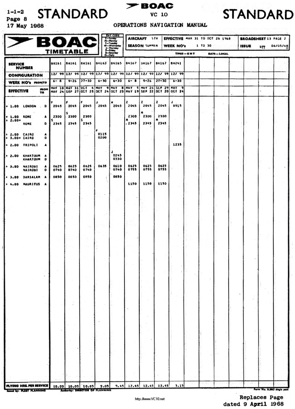 BOAC Standard VC10 1968 Summer Timetable