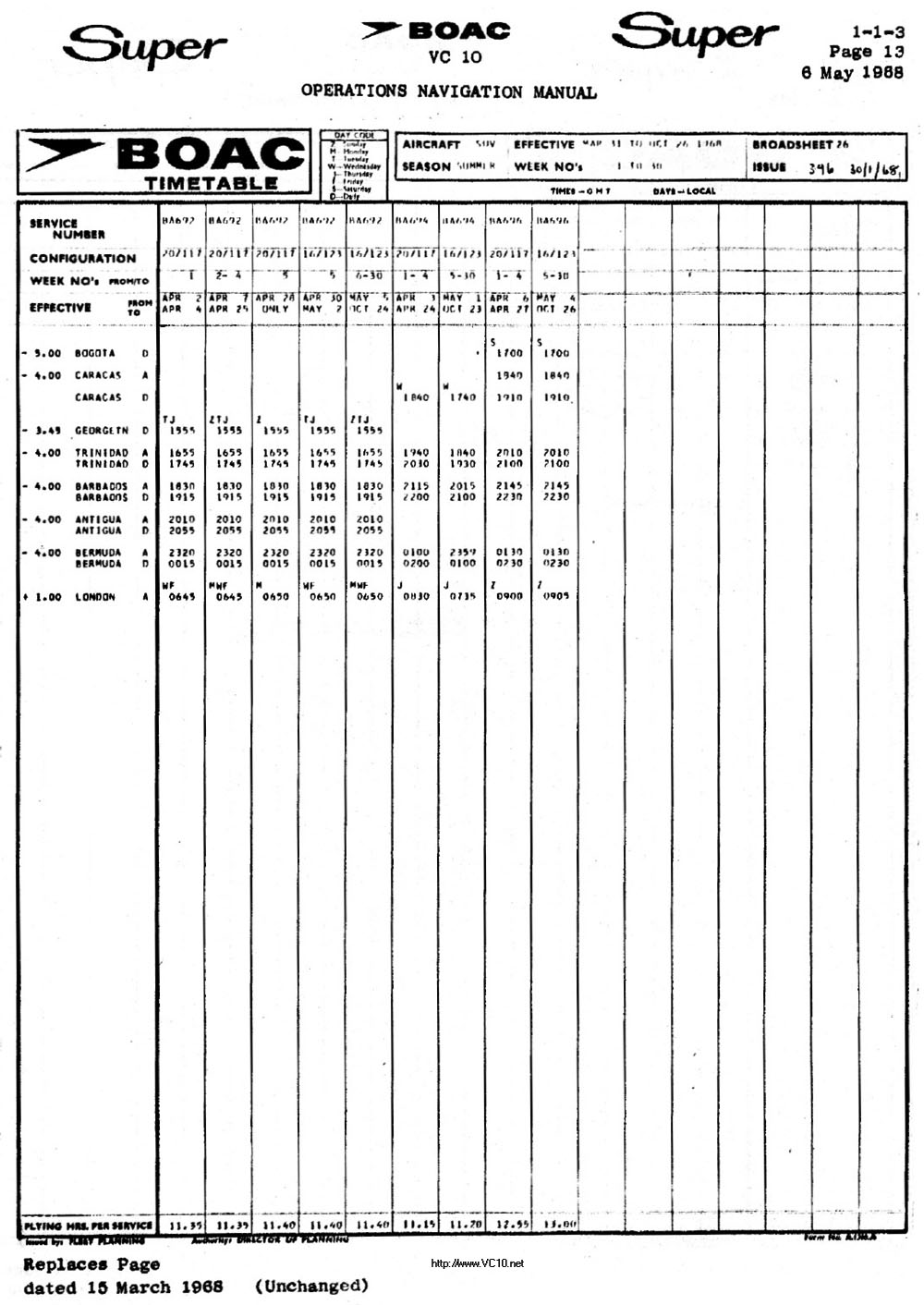 BOAC Super VC10 1968 Summer Timetable