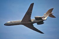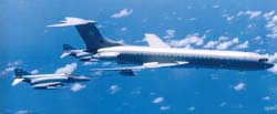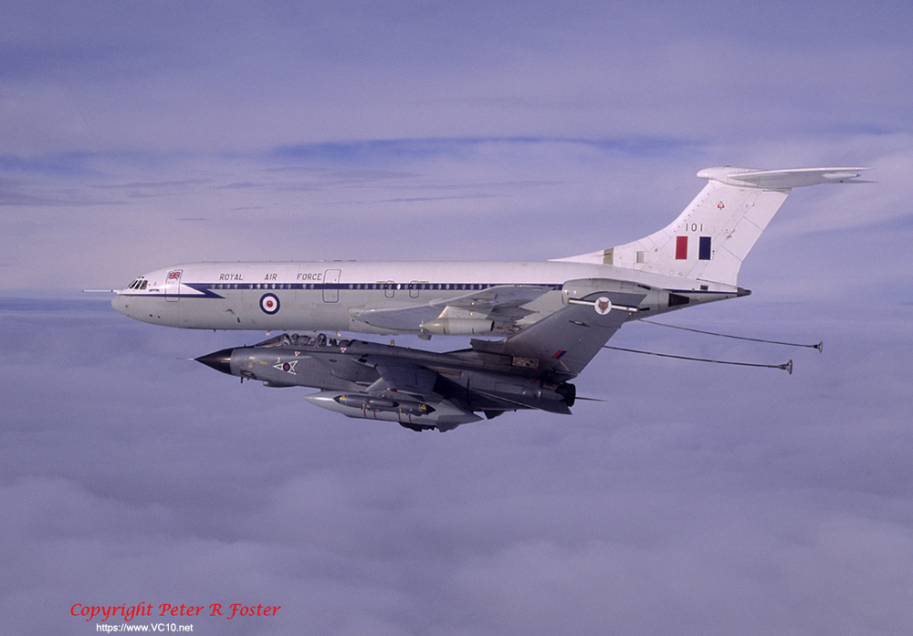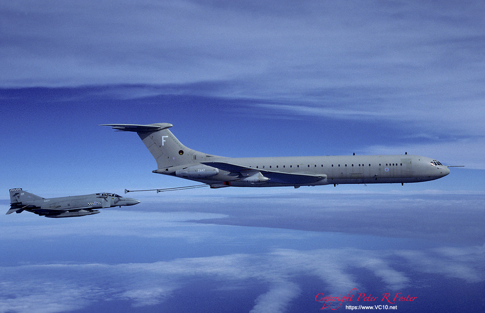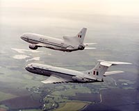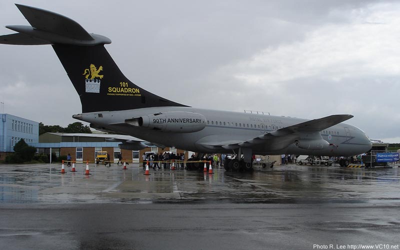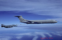 The VC10's duties with 10 squadron can be divided into three tasks. The most heavily committed task was supporting preplanned exercises and deployments, which accounted for almost 75 percent of the squadron's flying time. The squadron also operated some scheduled routes, although these have been steadily taken out of service throughout the type's long career. When the VC10 reached 10 Squadron the scheduled routes constituted the major part of the squadron's work and for many years the RAF operated the type as a regular airliner. The VC10s flew mixed loads of cargo and passengers, for whom the main difference between a BOAC flight and 'RAF Airlines' were the military style rear-facing passenger seats. With the British military withdrawal from the Far East the weekly or daily flights were deleted one by one, thereby ending the 'RAF Airlines' chapter. The third task undertaken by 10 Squadron was the one that was foremost in the public eye as these were the so-called 'Specials'. These included VIP transports, aeromedical evacuations and disaster relief. Obviously the VIP flights got the best media coverage. Regular passengers included the Prime Minister and other Government ministers, foreign Heads of State, Service Chiefs and at times the Royal Family. Early in the nineties a contract was signed with Flight Refuelling for conversion of the squadron's C Mk 1s to C Mk 1 Ks. The first aircraft was ferried to Hurn in 1991 to be the first to be converted to Air to Air Refuelling Status, and by 1996 the entire fleet had been converted. The conversion added two wing mounted Mk 32 refuelling pods and a CCTV camera under the fuselage. No extra fuel tanks were installed in the fuselage so the full passenger and freight capability of the aircraft was retained. The refuelling capabilities of the C Mk 1 K were only used when military passengers were carried, and as the main role of the squadron was still its transport function only half of the crews were trained for the AAR task. 14th October 2005 saw the last flight of a 10 Squadron VC10, as on that day the Squadron was disbanded. The remaining VC10s have all been transfered to 101 Squadron. While at first a measure to consolidate the VC10 operations, this was also a step towards the day when the VC10 would leave the RAF. In May 2011 the RAF announced that 10 Squadron would reform on 1st July 2011 operating the new A330 Tanker (KC-30 Voyager Tanker). In service with 101 squadron: aerial refuellers The mainstay of an airforce can be said to be its aerial refuelling capability. Any long range deployment relies on Air to Air Refuelling (AAR) to get aircraft to remote locations without the hassle of fuel stops. A major demonstration of this concept was provided by the 'Black Buck' missions carried out during the Falklands War which saw Vulcans fly non stop from Ascension Island to the Falkland Islands and back. Photo copyright BAE SYSTEMS The RAF's tanker force has relied on converted bombers for a long time, first operating converted Vickers Valiants, but also Victors and Vulcans. In 1978 the RAF announced their intention to form a squadron of nine VC10 AAR tankers. The contract was awarded to BAe Filton for the conversion of five ex-Gulf Air Standard VC10s to K2s and four ex-EAA Super VC10s to K3 status. The first K2 flew on 22nd June 1982 from Filton with BAe pilots Roy Radford and John Lewis. Initially, this aircraft was painted in a grey-green camouflage scheme but the other K2s were painted in a hemp-coloured camouflage before delivery to 101 squadron with the single camo VC10 reverting to hemp colours later on. Over the years the other aircraft were delivered, and 101 squadron commenced operations. The VC10 has proven itself as a very capable refueling platform. Because of the VC10's configuration the receiving aircraft is well away from the tailplane and the engine exhausts, which means less risks in turbulent weather. Since its inception almost 20 years ago, the squadron has flown too many missions to count, providing support in many troublespots, but also for a diversity of other deployments. By the early nineties the Victor K2s that were still in service were becoming very limited on fatigue life available, and the RAF was faced with a severe shortage of tankers. The answer to this problem sat waiting in a field in Oxfordshire, at RAF Brize Norton and at RAF Abingdon, in the form of the ex-British Airways fleet of Super VC10s. Out of the fourteen airframes available five were eventually converted to VC10 K4s, thereby augmenting the tanking fleet of 101 squadron. At the same time the conversion of the C Mk 1s was undertaken, which further expanded the RAF's tanker fleet. On the day of the last operational VC10 K2 flight, the opportunity was used to line up the four different VC10 types in use, the last time this would be possible. From left to right: K2, K3, K4, C1K. Photo Crown Copyright/Darren Hall, MOD UK In 2001 the VC10 K2 made its last flight as a tanker. The five K2s were the oldest airframes in the fleet, and over the years some of these airframes had already been temporarily stored when not in need. Since then all the K2s were ferried to RAF St. Athan where they have been 'reduced to spares', a colloquial term for the scrapping process that will reduce a once lovely airliner to a pile of scrap metal. In the meantime the rest of the VC10 tanker fleet was still going strong, and was scheduled to remain in service until early 2013. With the disbandment of 10 squadron in October 2005 the remaining C1Ks were transferred to 101 squadron and February 2006 saw the first C1Ks sporting 101 Sqn crests and tail letters. From that point on 101 Sqn operated three VC10 variants but from 2010 on airframes were taken out of service regularly for spares reclamation and scrapping. The spare parts which were generated in this way kept the remaining airframes in the air until their scheduled out of service date. At the celebration of the 50th anniversary of 