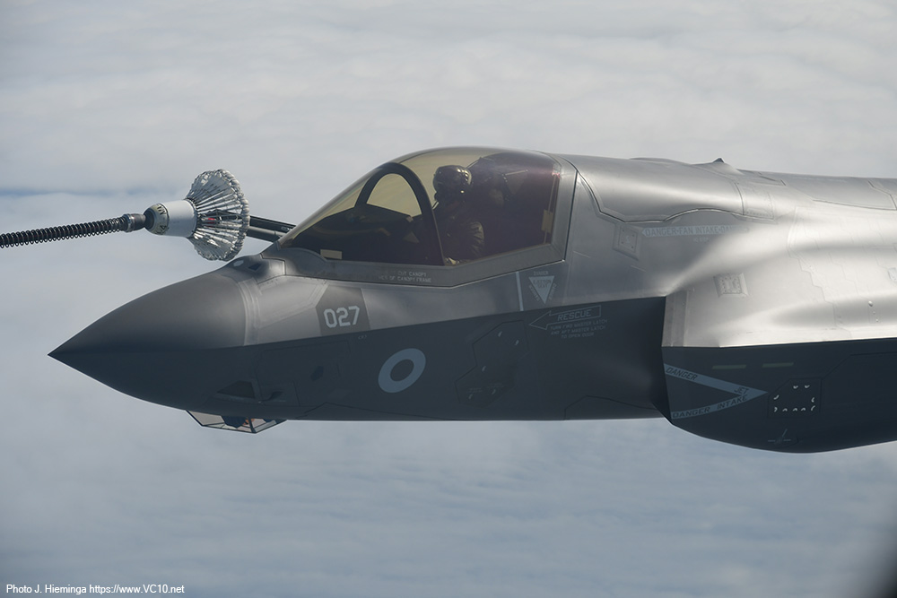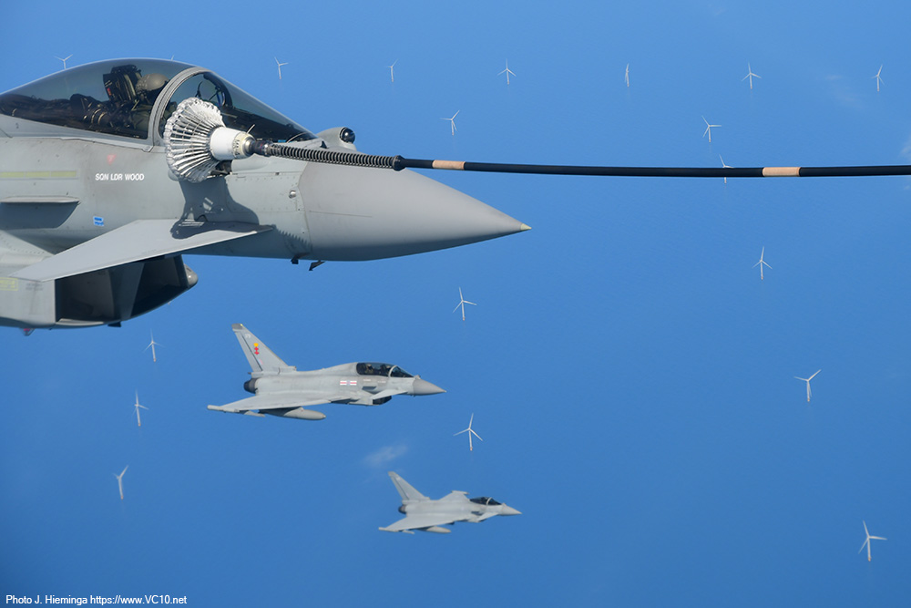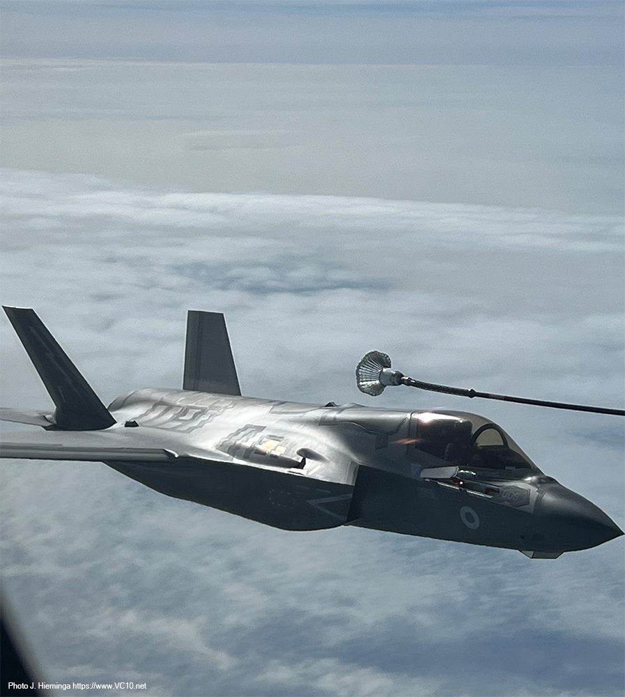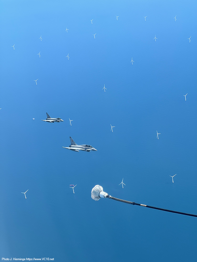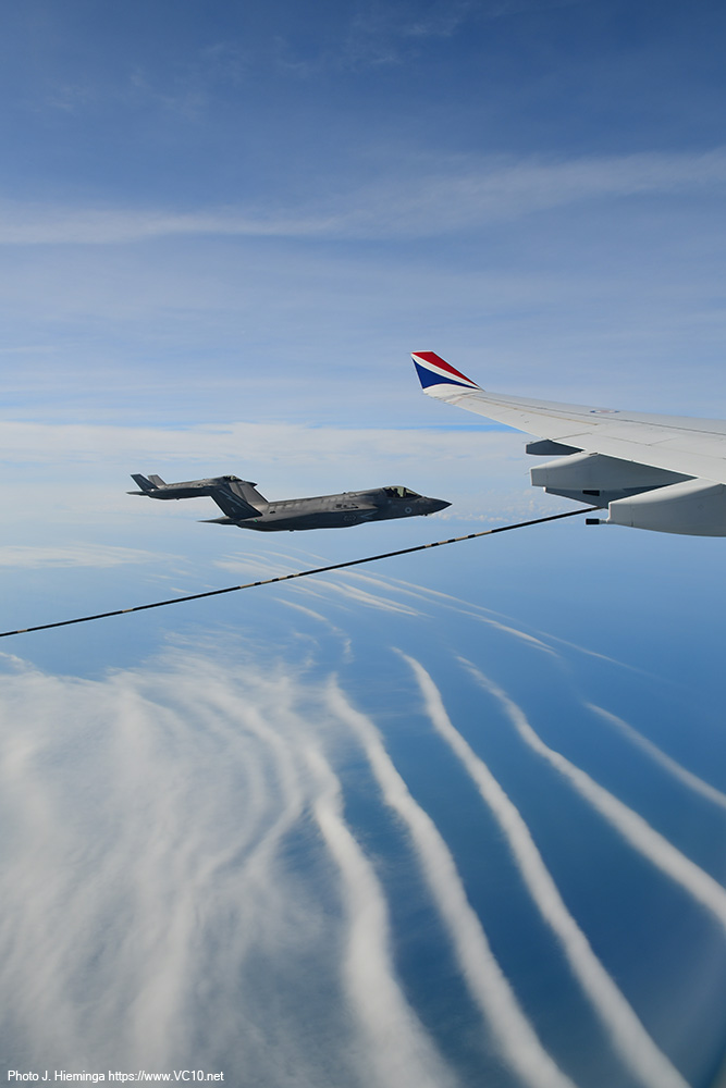 The crew shared some details of the expected trade with us at the start of the flight and first to show up were a pair of F-35s from RAF Marham. After taking up a position just off the left wingtip they were cleared in to the refuelling hoses. They quickly established contact and spent the next five minutes sitting there off the side of the tanker happily taking on a couple of tons of fuel each. The main purpose of the visitors on this day was retaining currency in AAR operations but refuelling fighters comes with the additional benefit of more training time in the air and fewer take-offs and landings at their base. Once I had seen the process a couple of times I was reminded of the basics of AAR operations, which was later confirmed and expanded upon by the Voyager's aircraft commander. The fighters approach at an altitude 1000 feet below that of the tanker until they establish visual contact with the tanker. They can then convert the excess speed that they used to catch up with the tanker into a bit of altitude to end up alongside the A330's left wingtip. The refuelling coordinator on the flight deck, who can keep track of the various aircraft around the tanker with several cameras displayed on the screens in front of him, clears the fighters to the right or left hose and keeps track of fuel offloaded, the time spent doing this and a number of other details. After receiving the allocated load of fuel, a fighter will move back to disconnect from the hose and transfer to a position on the right wingtip, awaiting the rest of the formation. Once all the fighters in that formation have refuelled and are in formation off the right wingtip, the are cleared away from the tanker and they will then climb another 1000 feet to clear the tanker, accellerating away from it in the process. The weather over the North Sea included some low cumulus clouds and patches of stratus low over the sea but mostly clear skies so that for a lot of the flight the fighters were clearly seen against the blue of the sea, sometimes dotted with wind turbines. The A330 stayed inside a designated area, flying an elongated holding pattern in a roughly east-west direction. Because of this, the fighters were brightly illuminated by the morning sun on one side of the track, and partially backlit against it on the other half, both situations offering their own fantastic photo opportunities. During a turn a refuelling fighter on the left side appeared to move down relative to the tanker (not completely incorrect... but the difference in indicated altitude is negligable) and this provided some lovely images against the backdrop of the North Sea wind farms. The crew looked after us very well, supplying tea, coffee and a hot breakfast to keep us going. There were regular messages from the flight deck announcing some breaks in the programme as the tanker remained on station without any fighters to supply, or announcing that a new set of customers was on the way. Once the first two waves of F-35s had finished their job, some Coningsby based Typhoons took over with up to three of them joining us at a time. Three Marham based F-35s formed the last wave of customers. Air-to-air refuelling is seen by a lot of crews as 'the sport of kings' and they appear to be well-versed in this sport. The time needed to move into position and set up a succesful 'prod' was minimal for the visitors we encountered. Any aircraft displaces the air around it and the movement of the refuelling basket is influenced by this, something most clearly seen on the F-35 as what looks like an invisible bow wave sometimes appeared to push the basket away. Pilots try not to chase this basket but use references on the tanker to get themselves in the correct position. It takes training to get good at this sport and to keep yourself at the required level. What was on offer today was a very stable tanker in brightly lit conditions. I imagine the situation will be different when operational pressures, night, clouds, turbulence and other distractors can throw a spanner in the works. Having refuelled fourteen fighters (some of which had come back for seconds) in the space of just over three hours, having supplied almost 36,000 kg of fuel during the nine or ten loops around the racetrack pattern, it was time to reel in the refuelling hoses and return to Brize. The slightly longer return flight transited across the East Midlands, turned south towards Cheltenham and looped around Brize to land back on runway 25 after four and a half hours in the air. Procedures post-flight were some of the quickest I have encountered but that could be due to the fact that there was no baggage to collect, no security to go through, leaving only some quick photos in front of the airframe to delay the bus trip back to the terminal. It was a great way to spend a morning and I cannot thank the 10 Squadron organisation who organised this trip enough! The six-strong crew on the aircraft were great and, along with the escorting officer and all the personnel on the base who were involved, they also deserve praise. While it was no VC10 (I had to say that...), this experience has shown me first-hand how a tanker is a very valuable asset within the RAF, how the professionalism of the pilots and other crewmembers make something as tricky as linking up a high-performance fighter and a large airliner mid-flight look deceptively easy. And of course, I have a few photos to remind me of this wonderful experience.