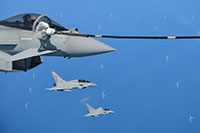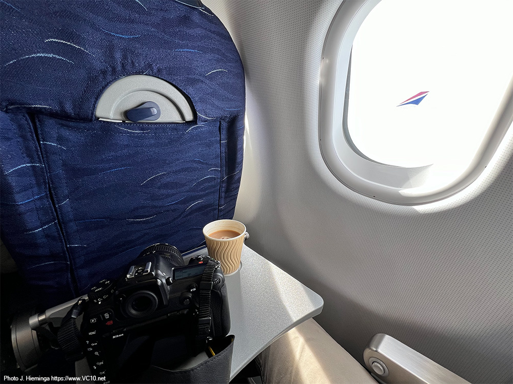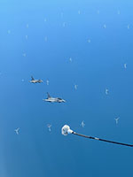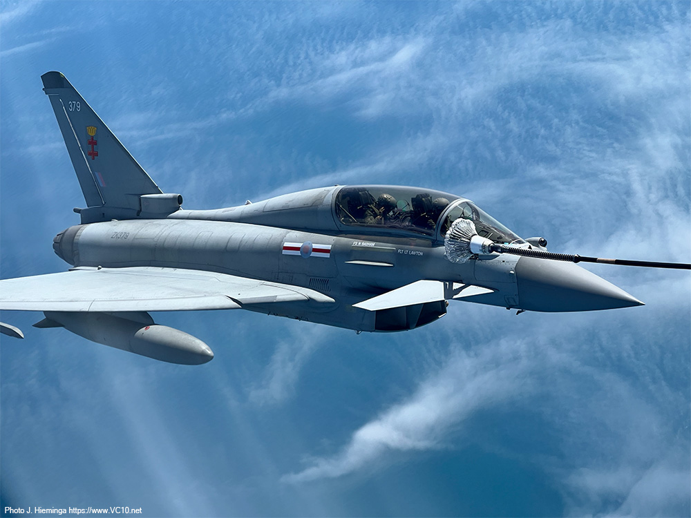 In May 2024 I got the opportunity to go along on a Voyager AAR mission from RAF Brize Norton. I have several stories on my website from people who were lucky enough to fly on a VC10 during an AAR mission but with the VC10s safely on the ground and staying there, this was certainly the next best thing. There was of course the question of whether the trip would take place, as operational constraints, changes in tasking or other factors may throw a spanner in the works, but everything came together and saw me at the main gate to the base at a rather early hour for a 6:45am check in. This takes place in Brize's terminal building and is not all that different from what you go through at every major airport these days, although there are some interesting differences. A RAF bus took us to our aircraft as the single stand outside the terminal was in use for another transport flight. Parked on a remote stand on the Brize platform was KC2 Voyager ZZ336, named 'Vespina' (although the RAF does not appear to use the name at all) and resplendent in the special 'government' colourscheme. With its VIP interior this airframe is a bit limited in the tasking it can take on as it cannot carry a full load of 291 passengers. Because of this, it is probably mostly used for UK towline sorties as that keeps it within UK airspace and the limits imposed by its special interior do not matter. The rear cabin of the Voyager is no different from any A330 airliner although seeing the cabin crew in RAF flight suits does remind you of the fact that you are on a military aircraft. As there were only 18 passengers, almost everybody got a window seat which bode well for the viewing opportunities later on. Driving down to the RAF base there had been some fog between the Cotswold hills and the view from the Voyager seat showed a line of grey A400Ms fading into that same mist. There was enough visibility for the take off though, well above the RAF limits, a suitable alternate in case of trouble after take off and a forecast for that fog to have burned off by the time we would return. So after a quick start-up and taxi out with a standard briefing from the cabin crew we took off at 8:30am into a gloomy grey sky, popping out of those clouds only minutes later to see a sunny blue sky. It took 30 to 35 minutes of flying to get to the assigned refuelling area off the Norfolk coast and our assigned altitude of FL160. The warning that interesting things might be happening soon was the sight of a refuelling hose being deployed outside the window.
