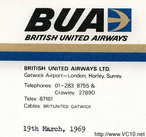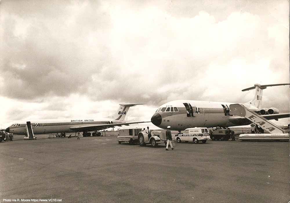 Click here to see a route map of Air Malawi's services in the '70s. Freddie Laker was involved early on with the VC10 design, as he saw another way to use the airframe, this leading to the cargo door-equipped Type 1103. Laker's BUA did not operate a passengers only service, but filled up the half-booked aircraft with five tons of cargo, thus making otherwise inoperable routes pay again. In this way BUA had found its own niche in the airline market, one which would later on be fully exploited by larger companies. Initially BUA ordered two VC10s, G-ASIW and G-ASIX, but when Ghana Airways canceled their order for a third VC10 this airframe was completed as a type 1103 and sold to BUA as G-ATDJ. Once G-ARTA, which had been converted to airline standard, came back from its lease to Middle East Airways, the by now independent Freddie Laker sold it to BUA, adding it to this fleet. The entire fleet was sold to British Caledonian when they merged with BUA in 1970.