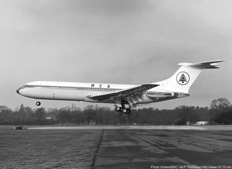 Although Middle East Airlines had wanted to buy VC10s, they never did as at that time the VC10 story was at its public and political worst. Buying 707s instead it looked as if this was a missed opportunity, but in 1967 MEA leased under-utilized 9G-AGP from Ghana Airways to fill the gap until the 707s could be delivered. For the same reason G-ARTA was also leased, this time from Freddie Laker's Laker Airways, as OD-AFA. Sadly 9G-AGP was lost in a military action at Beirut Airport in December 1968, fortunately empty, and G-ARTA went back at the end of its twelve month lease only a few months later.
