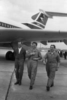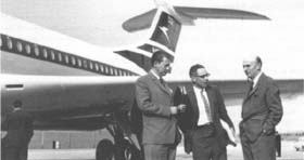 Cairns (left). The fact that the rear-mounting of the engines also gave the VC10 a quiet interior was a sheer accident - but another big plus. In turn, it provided the fundamental advantage of superior passenger attraction, which no amount of comparative cost formulae could take any account of - but which sustained it throughout its operation. The Changing Outlook This, then, was the basis of our response to the BOAC need - which was that all the routes that they wanted to serve with jet aeroplanes, but could not at that time accommodate the 707, would be served by the VC10; hence a large fleet of VC10s was going to be the backbone of the airline's global operation. So we signed a contract for 35 with an option to purchase another 20. There was certainly a number of people in high places in the airline who at that time saw an elimination of the 707 and their fleet becoming totally VC10, because we had already devised a larger version – the Super VC10 - in which the good airfield performance had enabled us to put on a longer body and to carry a much larger payload into the bigger airfields that were then beginning to appear. Whereas theVC10 was obviously in a poor position compared with where the V1000 would have been, because it was now several years later, it still looked a good bet. But as time went by, the pressures inside BOAC to unify its fleet went through a complete reversal and the eventual compromise was that they had a mixed fleet of VC10 and 707. It is well-known history that the passengers much preferred the VC10; the passenger load factors, and hence the revenue earning capacity, were very much higher, and the pilots liked the aeroplane, especially the low landing speed. It therefore proved to be very successful - except for those of us who made it, because we lost a lot of money on it, the total quantity that we built being only 54, including 14 for the Royal Air Force. But it was an aeroplane built to a tough requirement which in the fullness of time evaporated. The Achilles heel of the British aircraft industry over the years had always been the home market; not only that it was not very big, but that it tended to get specialised because the operators - military as well as civil - had their own peculiar needs. From their point of view, this was probably quite justified, but tended to get the manufacturer into devising specialised equipment that was not universally acceptable. 'Mr VC10' Sir George Edwards (right) with Ken Lawson,