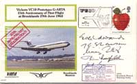 Aerodynamicist Heinz Vogel was the driving force behind the VAFA covers that were flown on various VC10s over the years, as well as on other types to commemorate various significant dates from British aviation history. The main VC10 related cover is VAFA number 9, as shown above, as that was produced to commemorate the first flight of G-ARTA on 29th June 1962. The commemorative flypast by XR806 25 years later was the main event where these covers were carried and Heinz Vogel organised signatures from the crew as well as various people who had been involved with the type. Shortly afterwards, A4O-AB was retired to Brooklands and a number of these same covers were carried on this flight, this time with relevant signatures from the crew and the Omani ambassador. As shown above, there is also a '30th anniversary' version, so this may be the most re-used cover out of the 25 different versions that VAFA produced over the years. |