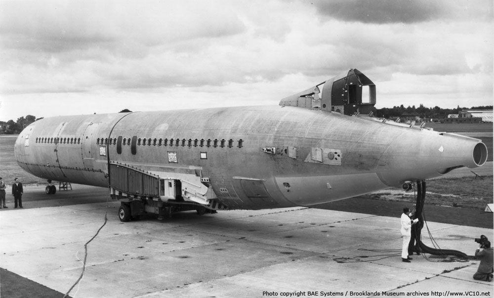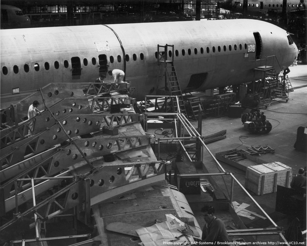 In a second installment after having added Vickers' own progress reports on the development of the VC10 to this website, I have now created these pages which pay tribute to the development of the VC10 50 years ago. The recollections below and on the subsequent pages were written recently by Maurice Ungless, at the time of writing 73 years of age, who felt that this was the right time to look back on his years with Vickers Armstrongs at Weybridge and Wisley. During his time there he was involved with the VC10's development as a ground crew member, which took him to many locations around the globe and even across the equator! The story of my relation to the VC10 begins around August 1959, when as an apprentice at Vickers Armstrongs (Aircraft) Weybridge I was attached to the Tool Room Inspection Department, which saw me taking part in the initial construction alignment checks of a VC10 fuselage sub-assembly jig. Before this, from January 1958 to December 1958 I had been involved in the construction of the first Vickers Vanguard G-AOYW. I ended my apprenticeship at Wisley at 22nd August 1960, but stayed there as Aircraft Ground Crew Technician on Vanguard development trials, until circa August/September 1961. I was then re-deployed to Weybridge for the construction of the first VC10 G-ARTA, which started in Weybridge Assembly Line Hangar W1, the location now of which is a housing estate, Staniland Drive/Dixon Drive area of Brooklands Weybridge. Historians may be interested in the fact that this Assembly Line Hangar also housed the construction line for amongst other types: Vickers Wellington Bombers, Vickers Vikings, all of the Vickers Valiant Bombers, some of the Vickers Viscounts, all of the Vickers Vanguards, most of the VC10s and some of the BAC 1-11s. With regard to the VC10 construction, only the fuselage and wing join up was carried out in W1 and some internal equipment was installed during this period, the hangar roof being too low to install the fin, rudder and tail plane. On completion of the VC10 fuselage structure in B1 assembly hangar, on the Oyster Lane side of Brooklands (West Side), the fuselage would be transported on its transportation cradle, across the airfield to the W1 aircraft production line to have the wings fitted. During this process of transporting the completed VC10 fuselage from B1 to W1, the assembly was temporarily parked on a concrete hard standing adjacent to the River Wey, where previous aircraft types, Viscount, Valiant and Vanguard, had their engine ground runs carried out prior to their first flights. The purpose of this temporary halt in transportation was to carry out a pressure and leak test of the fuselage structure to a proof pressure of something like 10.5 psi. On satisfactory completion of this test, the VC10 fuselage transportation was then recommenced to the W1 production line for the fitting of the wings. The VC10 wings were constructed in W1 Wing Shop, which was located to the rear of the aircraft production lines, at the same location as where the Valiant and Vanguard wings had been constructed, then fitted to those aircraft types on the production lines. At a certain point during their construction the individual aircraft were transferred to the larger assembly hangar commonly known as either "The Abbey" or "Cathedral", where all the final assembly was carried out. Fitting of the fin, rudder, tailplane, engines and undercarriages, and all that had not been installed in W1. All aircraft of whatever type would then cross the river Wey by way of the old Brooklands track at the end of what is now Staniland Drive at the Southern end of Brooklands. Areas of extra concrete were added to the original track for the aircraft to be manoeuvred onto the taxi way, for access to the runway, or ground running engines adjacent to the river Wey in the case of Valiants, Viscounts and Vanguards. This section of track/taxi way can still be seen on Google Maps or Google Earth today. For VC10s and BAC 1-11s, ground runs were always carried out at the North end of the runway, about where the Mercedes Benz buildings are located now. Perhaps a few little known facts will emerge from my story, and experiences. However in any birth, complications and pain can ensue. It was no different for the VC10, some minor and major disasters unfolded.. My contribution to the construction of G-ARTA was trial fitting and installing the engine fuel supply pipes, valves and associated shrouds, (where required), from wing trailing edges, in and across the undercarriage bays, and through and above the aft cargo hold to the engines. From these trial fittings and installation, pipe jigs were manufactured for subsequent manufacture of all fuel pipes for the VC10 production. This was the first of a few problems to become apparent in construction. The first production pipes, from aft cargo hold front bulkhead aft, were made by the pipe "benders" from the "lofted drawings" which were full scale drawings on aluminium sheet metal. It was found that the pipes didn't fit the aircraft! Attempts were made several times by the pipe benders, until I noticed that the lofted drawing had the incorrect datum for measurements to be taken from. Once the correct datum was used and new pipes were constructed everything fitted correctly. Also during this period I was involved in fitting the water ballast system which consisted of large water storage tanks and associated pipes, valves and pumps to the forward and aft cargo holds. This system was to allow in-flight adjustment of the aircraft's C of G (Centre of Gravity) during trials, without resorting to landing and physically moving ballast, before another test flight at a different C of G. During this phase of construction the wings were ready to be mated with the centre section of the fuselage and here another problem turned up. On lining up the wing to fuselage abutment joint, the datum point for the wing at the wing tip (a point on the hangar floor) had t