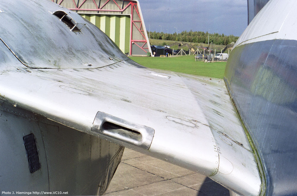 This next Farnborough Airshow was in September 1962, some 10 weeks after G-ARTA's first flight, and the VC10 was to be shown off to prospective customers and the public. Preparations were made for G-ARTA to fly from Wisley to Farnborough, however on engine start up at Wisley one engine failed to start. On investigation it was found that the subject engine's high pressure engine driven fuel pump had failed. By the time a replacement had been sourced, fitted, bled, fuel leak checks and ground runs carried out, it was then too late for the ferry flight to take place, so this was delayed to the next day. I was part of the ground crew which was to accompany G-ARTA on its first Farnborough Airshow appearance. One abiding memory of that show was standing by the VC10 at the parked position for the flying show, across the runway from the crowd. A squadron of English Electric Lightnings took off one after the other and climbed vertically exactly above us. We were looking up into the jet pipes and afterburners, and I thought what if one flames out, we are directly underneath! Some other early trials on G-ARTA were carried out at RAE Boscombe Down as it was found on initial flights that the VC10 did not meet its promised performance due to excessive drag. The ground crew either travelled by road to Boscombe Down, flew down in either a company de Havilland Dove or Heron or when possible the VC10 itself. As aircraft Ground Crew Technicians, I with others was deployed for early investigative work and development at Boscombe Down with G-ARTA. One task was the excessive aerodynamic drag encountered beyond design criteria expectations and another was vibration/rumbles from the rear of the aircraft. The vibrations/rumbles were caused by reverse air flow around the engine pylon rear cascade fairings between the two thrust reverser outlets on either side. When tufted wool strands were installed on the fairings around the area of the cascade panels, and a test flight was carried out, photos taken by an English Electric Canberra flying along side showed a reverse airflow condition. I was on that flight and witnessed first hand, visually through the rear periscope, the reverse airflow condition. This was solved by designing and fitting of the Beaver Tail extensions between the engine exhaust units to all subsequent VC10s. In an attempt to solve or understand the excessive aerodynamic drag encountered, and for future development of the wing for the Super VC10, the slats were locked out at something like 3 degrees extended and the consequent gap between wing leading edge and slat lower and upper surface was filled and bridged with balsa wood and hessian cloth, bound together with liberal amounts of 3M adhesive dope. The flaps had similar treatment also being extended a few degrees and locked out. Again the gap filled as with the slats. We were back to the start of the evolution of flying, wood, fabric and dope. G-ARTA then took-off with no additional flap or slat extension. Hence the need for using Boscombe Down as the runway is something like 3 miles long. The ground crew were not allowed on this flight as you can imagine. From this information the wing for the Super VC10 was redesigned, adding a dog tooth leading edge on the outer section, but no outer wing fence other than a small section at the leading edge. The Super VC10 also has a different wing tip which increased its wing span. That caused problems getting it into the hangar at Wisley as after each flight the aircraft were put inside and each time both wing tips had to be removed and then re-fitted once outside, before the next flight. Another issue found during this first phase of flight trials was that when deploying the speed brakes or when spoilers were deployed during aileron movement there was excessive vibration and buffeting. This was solved by cutting the 2 trailing edge corners of each speed brake/spoiler panel, off diagonally by approximately a 9 inch x 9 inch section. The adjacent wing top surface of the trailing edge structure which had been left vacant was then filled in. Another incident during the early days of development of the VC10 were problems with the control surface panels, which were constructed with honeycomb skins. From memory it was only the aileron and elevator panels and not the rudder panels that succumbed to de-lamination during early days of trials. To document the scale and increase rate of de-lamination I remember a regular "tap test" being originated in those days. This was before the advent of X-ray technology or ultra sonic tests for aircraft structures. Although tap testing is a very rudimentary process of inspection for de-lamination, it is still used today for finding disbondment in several aspects of construction. Every control panel that was affected on every aircraft that then existed was put through a scheduled check of the "tap test", which consisted of placing a sheet of grease proof paper over each control panel surface and tapping the surface with a penny coin. This method then produced either a hollow or solid sound to the tapping of the coin. The areas were plotted on the paper, the markings showing the extent of disbondment, and this was annotated with the date and hours flown to build up a picture of the rate of the disbondment activity. The grease proof paper had datum points to align with structural points on each of the surfaces and was held in position with adhesive tape during the process, the sheets were marked with serial numbers and their respective control panel and particular aircraft registration. These were then stored in a library until the next scheduled test, when they were again placed on the surface being tested and another plot taken. Some time in the first 6 months of trials a VC10 had an emergency called during final preparations for landing. A main undercarriage showed an unlocked down condition, the dreaded red light. Several low passes were made over Wisley for the control tower t
